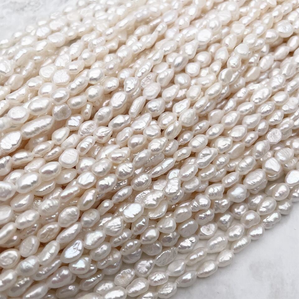 真珠のサイズは5.5~8.0mm*3.5~5.0mm前後でやや小粒の可愛らしい印象です。バロックライス型のため様々なサイズと形状が含まれています。写真に写っていない形状や傷のパールがある場合があります。