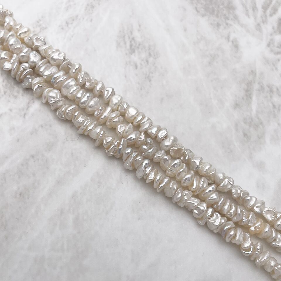 照りがあり薄い粒が多めの印象です。極小〜小粒のとても小さい真珠です。厚みは2~3mm前後でサイズと形状はまちまちです。手に入りにくいレアパールの一つ。