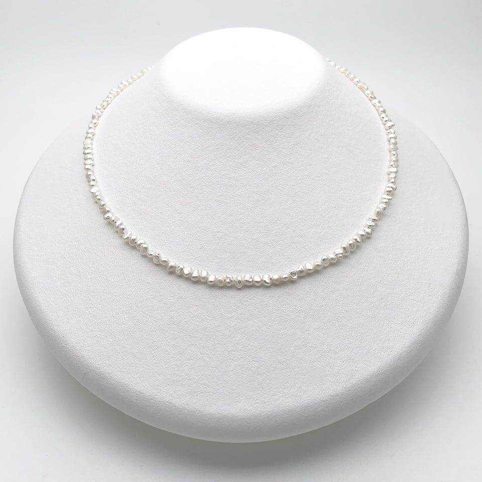 とても小さいバロックパールネックレスです。ナチュラルで不揃いな形状とさりげないサイズ感で、卒入学式以外のデイリーユースにもおすすめです。優しい照りを感じられます。