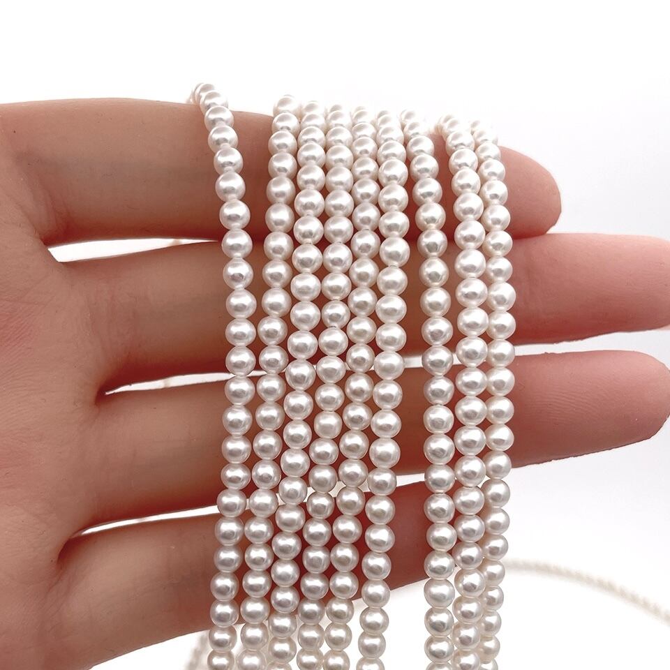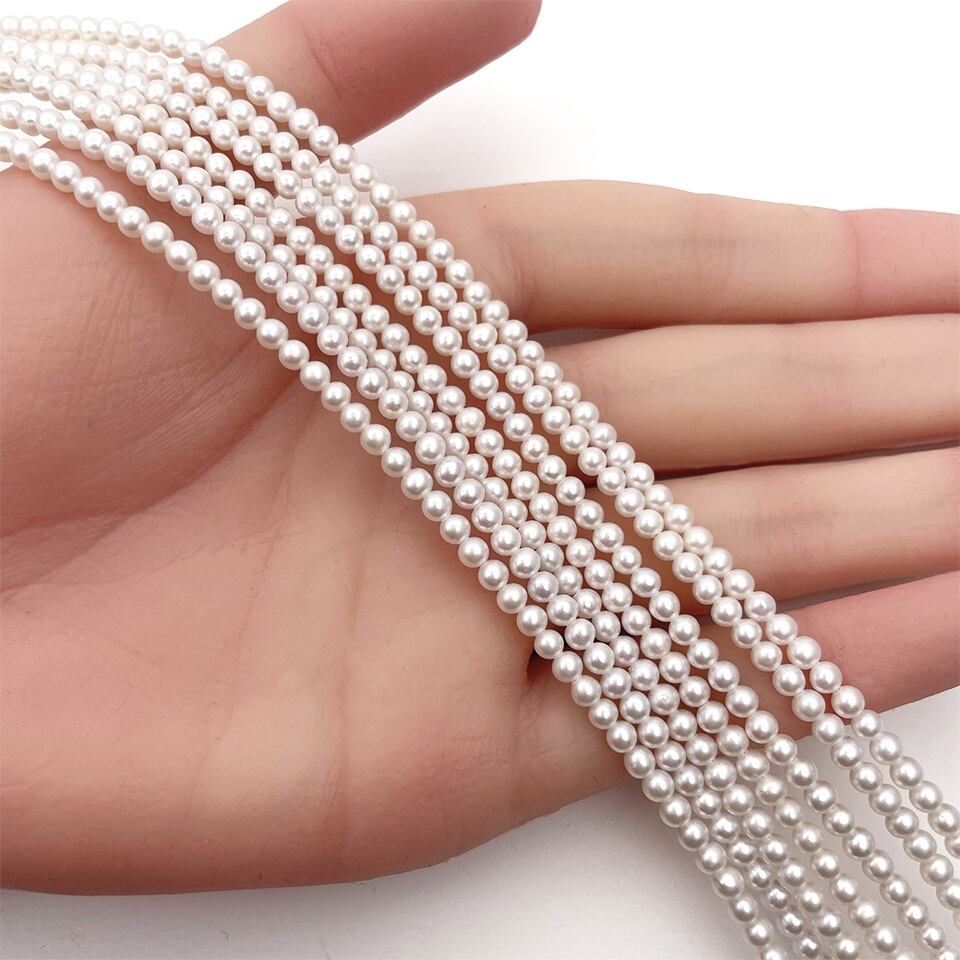 3.0~3.5mm前後の極小粒ながらも艶やかな輝りがしっかりと感じられ、傷が非常に少ない美しいパールで組み上げています。サイズ感は4枚目と5枚目の画像が分かりやすいです。