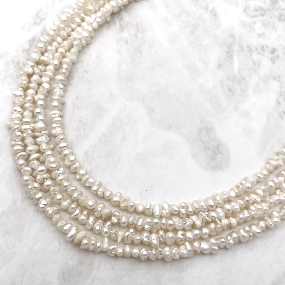 超極小サイズの無核の淡水ケシパール。近年は大粒のオイスターパールなどの有核パールの需要が高まり、無核のパールの生産量が著しく下がっているため、希少なパールの一つです。