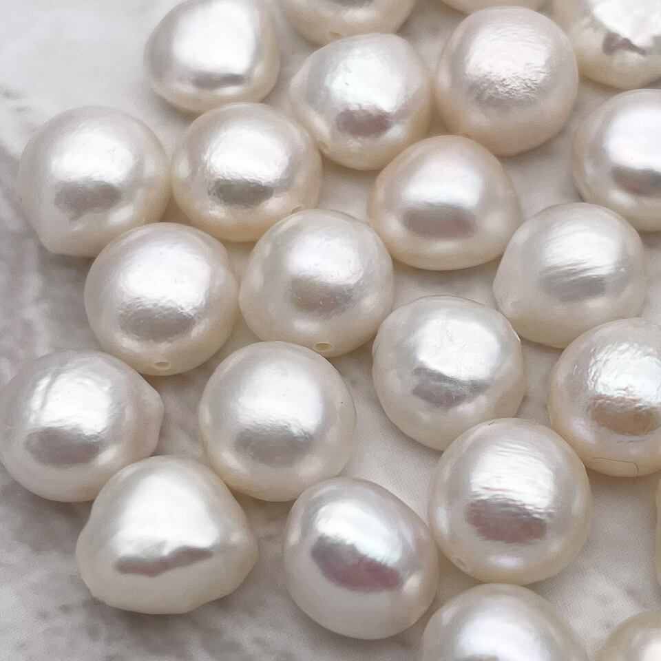 比較的形が整い、粒も揃ったホワイト系バロック淡水パール。裏面はフラットの真珠が多いです。