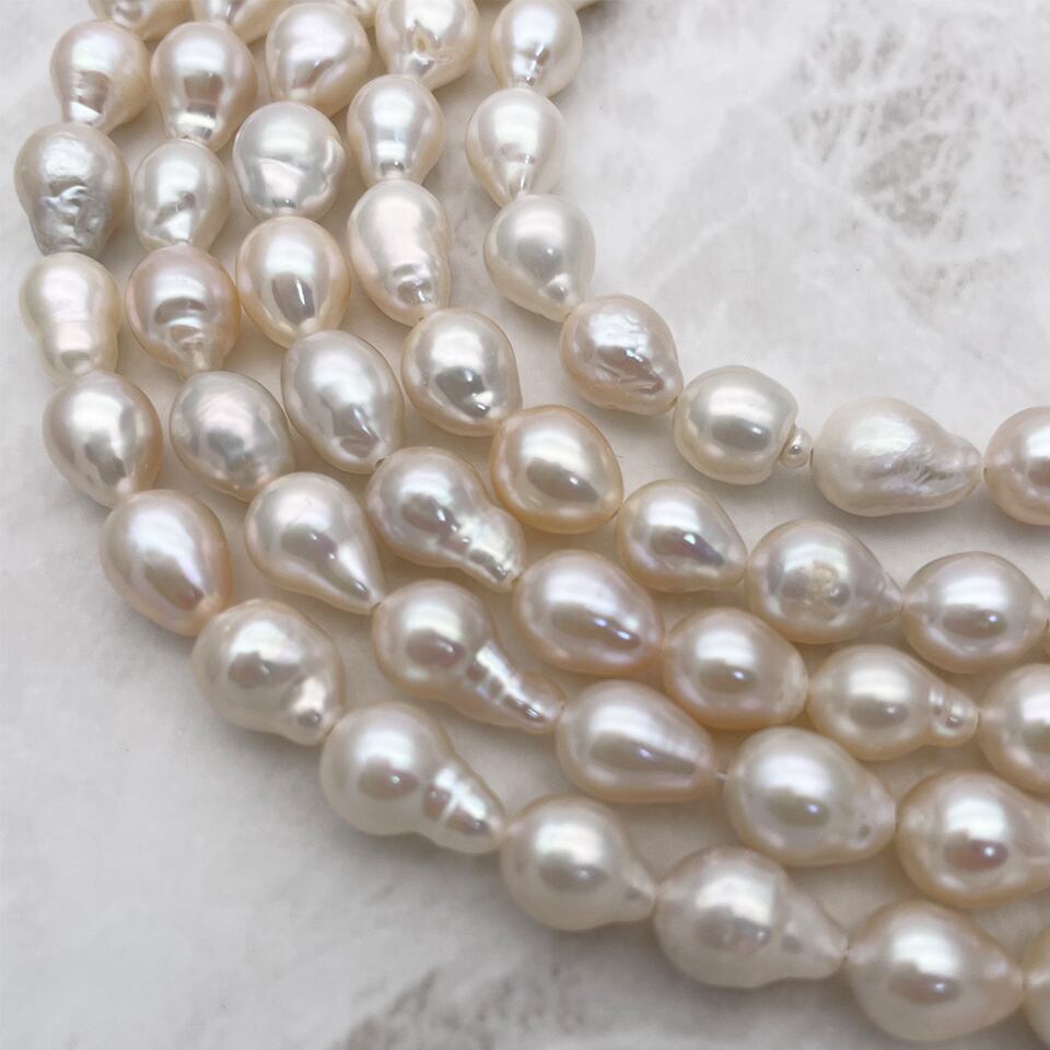 中粒の雫型バロック淡水パールです。艶がしっかりとありナチュラルな魅力が詰まっていますが、傷や変形がありますのでご留意ください。