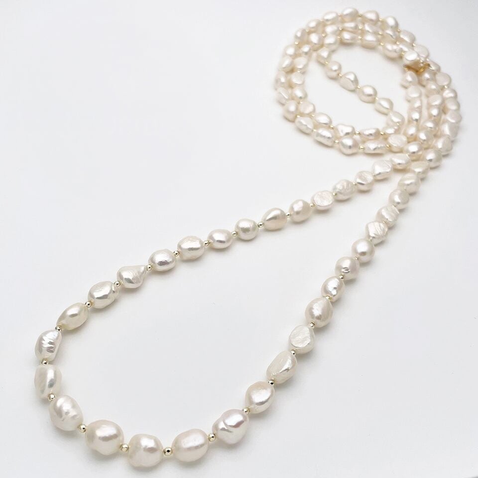 定番のホワイト系バロックパールを贅沢に使用したナチュラル感満載のロングネックレス。
