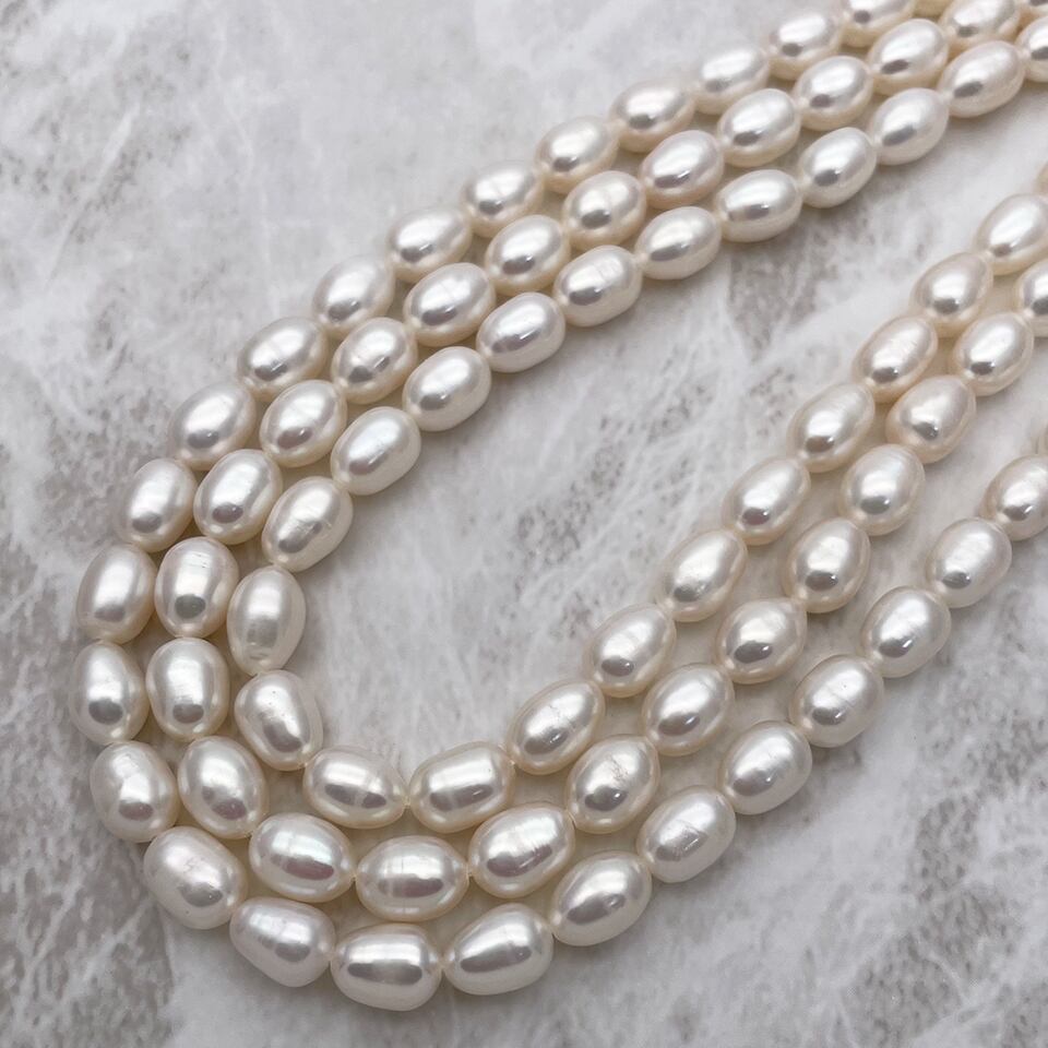 扱いやすいサイズ感のライス型淡水パールです。サークルや傷などのナチュラルな特徴がありますが、照りがしっかりと感じられる艶やかな粒です。