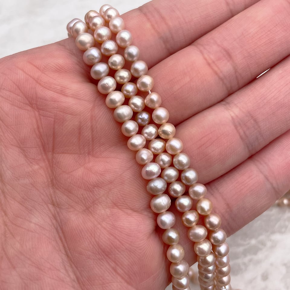 小粒の淡いピンクパープル系のポテト型淡水パール。多少の傷がありますが、照りもあり粒揃いで形の良いものが多いです。均一な色味ではない点にもナチュラルパールの良さを感じられます。